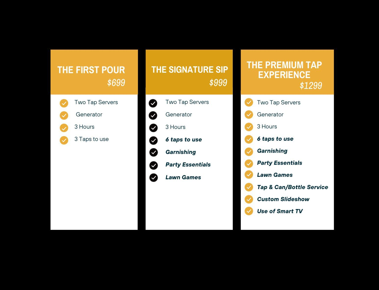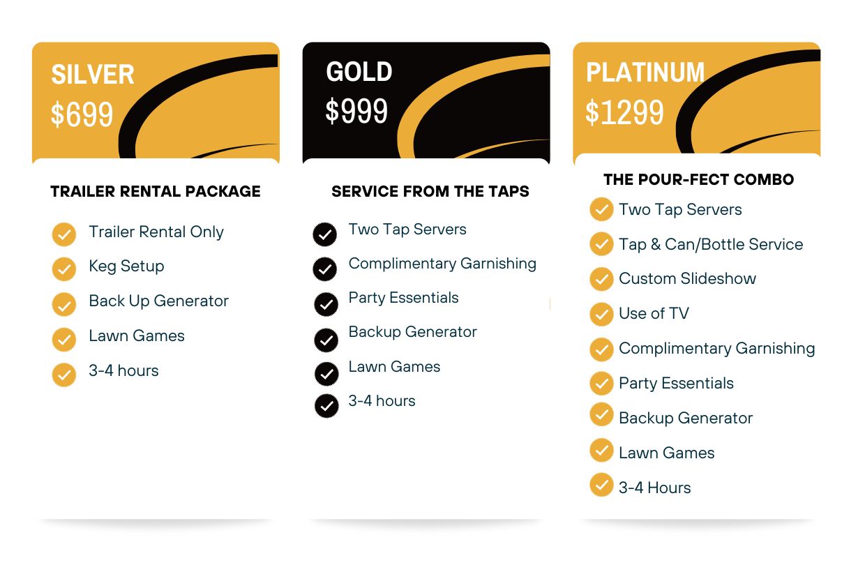Hosts provide and chill their own kegs and beverages. We handle the setup and service. All leftovers will remain with the host after the event.